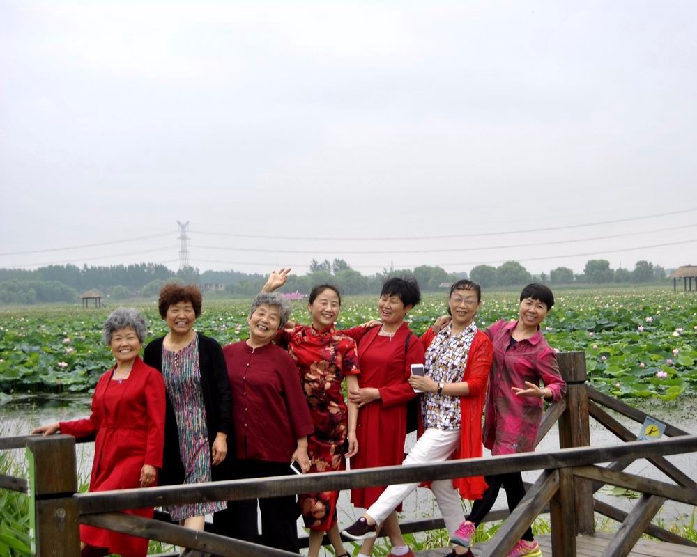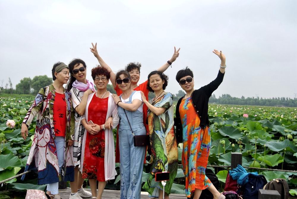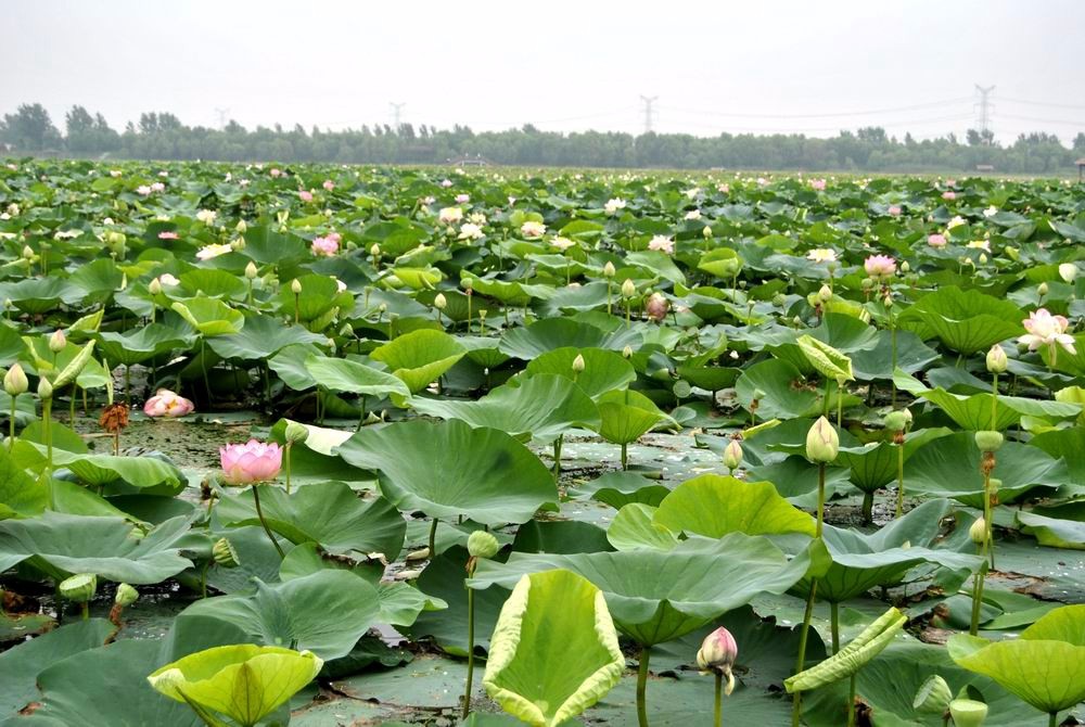 百畝荷塘花似錦,小橋游客效青蓮。