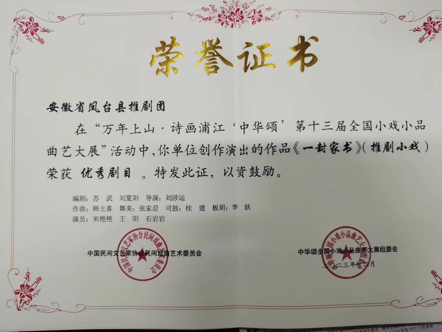鳳臺推劇在“中華頌”第十三屆全國 小戲小品曲藝大展中獲獎