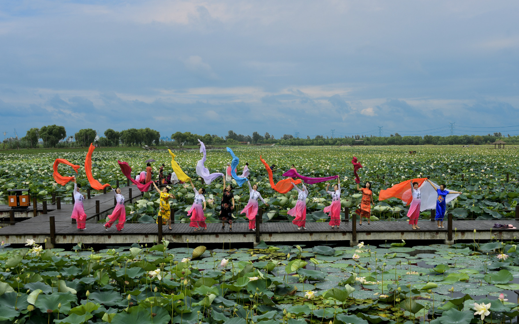 湖面上風起水波蕩漾,荷花迎風而舞。荷的清香隨女子的長袖綢帶飄蕩;女子以荷花的姿態行走。