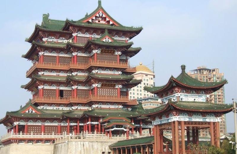 歷史上滕王閣先后共重建達29次之多,屢毀屢建。因滕王李元嬰始建而得名,又因初唐詩人王勃詩句“落霞與孤鶩齊飛,秋水共長天一色”而流芳后世。1942年,古建大師梁思成偕其弟子莫宗江根據“天籟閣”舊藏宋畫繪制了八幅《重建滕王閣計劃草圖》。在第29次重建之時,建筑師們以此作為依據,并參照宋代李明仲的《營造法式》(此書相當于現在的建筑規范),設計了這座仿宋式的雄偉樓閣。1989年10月8日,第二十九次重建的滕王閣勝利落成。