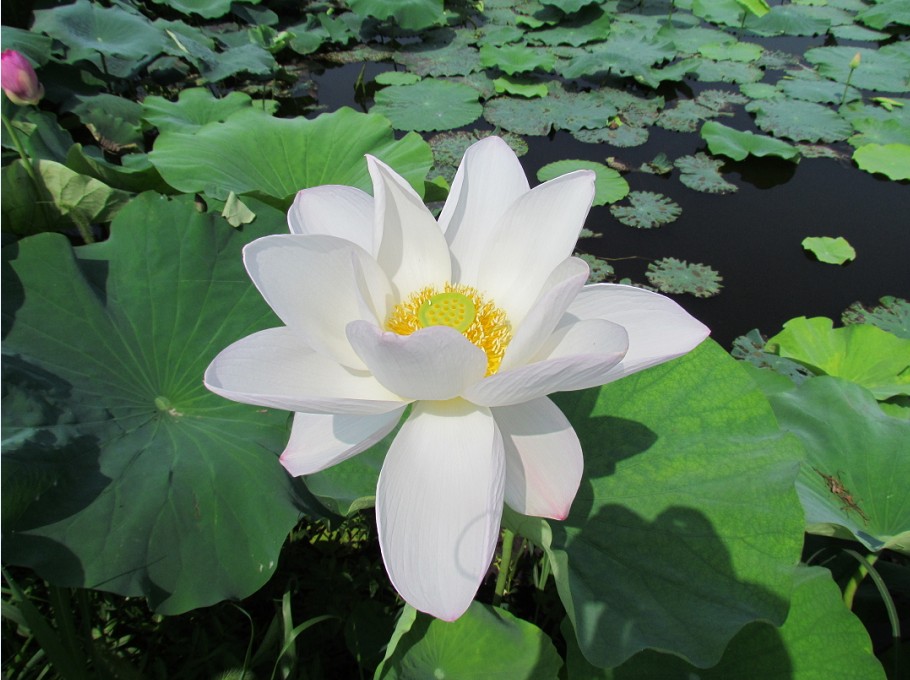 紅白蓮花開共塘,兩般顏色一般香。 白花笑隔盈盈水,別有池塘一種幽。
